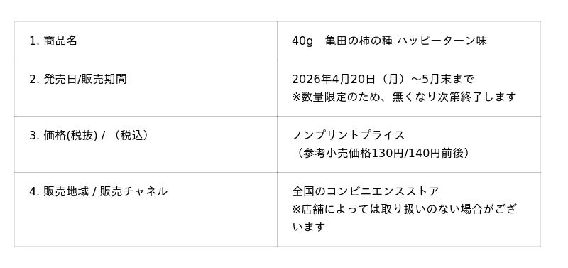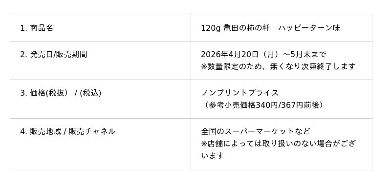亀田製菓株式会社(本社:新潟県新潟市、代表取締役社長:高木 政紀)は、「亀田の柿の種」(2026年発売60周年)と「ハッピーターン」(2026年発売50周年)のW周年を記念し、2つの味わいが入れ替わった期間限定商品『亀田の柿の種 ハッピーターン味』と『ハッピーターン 亀田の柿の種味』を、2026年4月20日(月)より全国のスーパーマーケットおよびコンビニエンスストアで発売します。