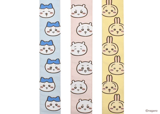 ちいかわ、ハチワレ、うさぎのおかおを全面にアピール!ストラップの表面にはちいかわたちのかわいい表情をレピア織りで美しく表現、裏面は手触りの良いアクリルテープを合わせました。