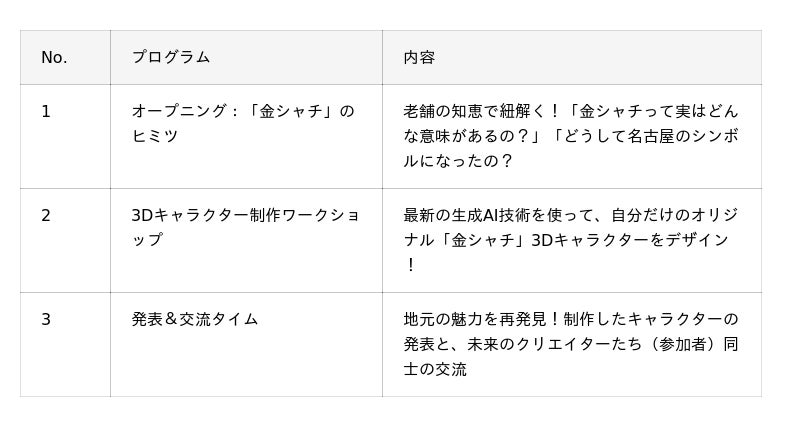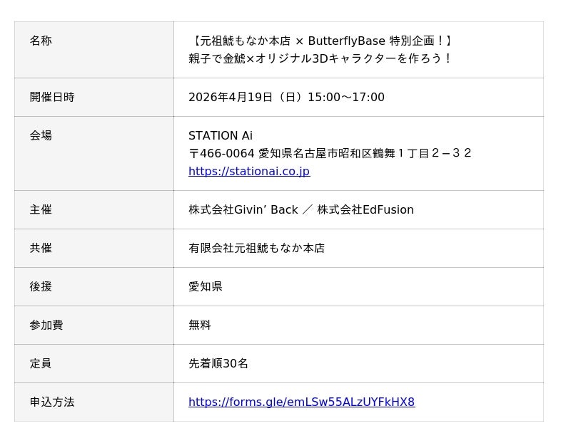 有限会社元祖鯱もなか本店(所在地:愛知県名古屋市中区松原2-4-8、代表取締役:古田花恵、以下「当社」)は、株式会社Givin’ Backおよび株式会社EdFusionが主催する親子向け体験イベント「親子で金鯱×オリジナル3Dキャラクターを作ろう!」を、2026年4月19日(日)15:00~17:00にSTATION Aiで共催いたします。参加費は無料で、定員は先着30名です。