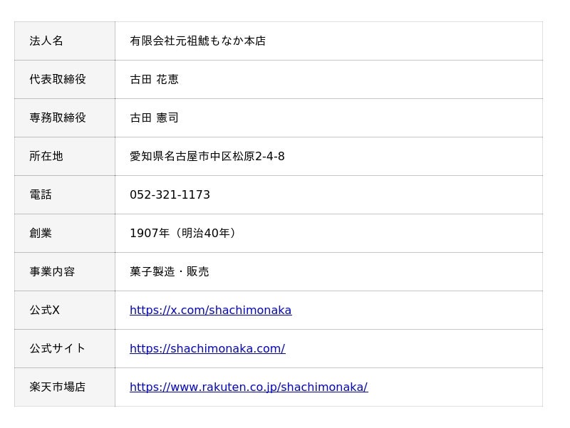 元祖鯱もなか本店の商品は、公式オンラインショップ(https://shachimonaka.com/)および楽天市場店(https://www.rakuten.co.jp/shachimonaka/)からもお買い求めいただけます。