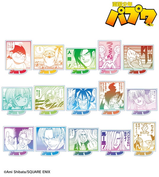 パプワくん、チャッピー、シンタロー、イトウくん、タンノくん、コタロー、ミヤギ、トットリ、アラシヤマ、グンマ、マジック総帥、ルーザー、ハーレム、サービス、リキッドのコマイラストをアクリルスタンドに仕上げました。