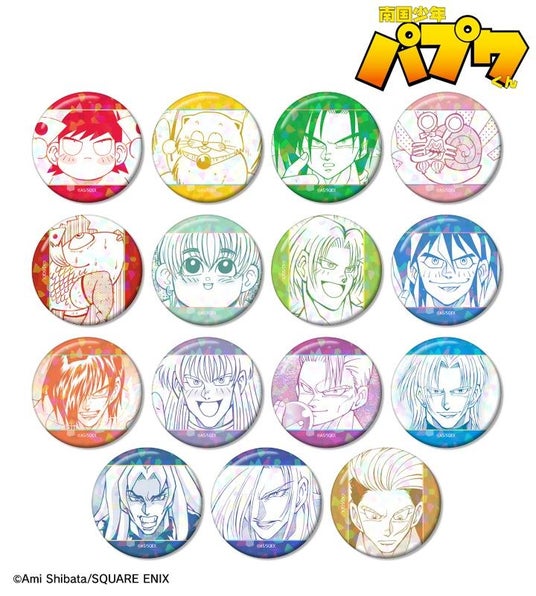 パプワくん、チャッピー、シンタロー、イトウくん、タンノくん、コタロー、ミヤギ、トットリ、アラシヤマ、グンマ、マジック総帥、ルーザー、ハーレム、サービス、リキッドのコマイラストをホログラム加工を施した缶バッジに仕上げました。