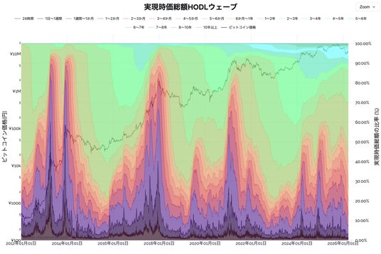 保有期間別にビットコインの供給量を層別表示し、資金の流入・滞留状況をサイクル単位で俯瞰できる指標。強気相場と蓄積フェーズで異なるパターンが現れる。