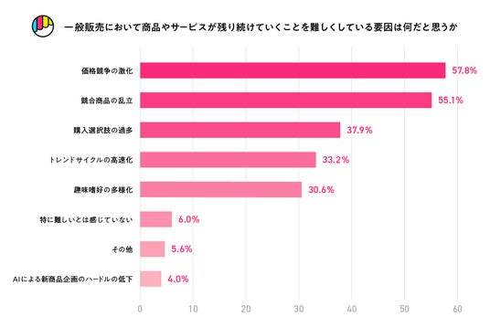 (2)商品が一般市場で生き残ることを難しくする要因として「競合商品の乱立」や「価格競争」が上位、次いで「購入選択肢の過多」「トレンドサイクルの高速化」などの声も。