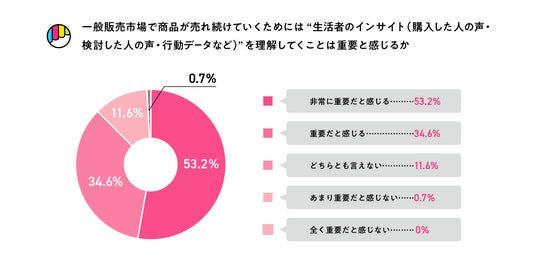 一般販売市場で商品が生き残り続けるために、実に約9割が「生活者のインサイト(実際に購入した人の声・検討した人の声・行動データなど)」が重要と回答。長く売れ続けるためには生活者を知ることが欠かせないと考えている実行者は多いようです。また生活者がAIと対話して商品を選ぶ時代に突入しても、しばらく生活者の生の声を聞く重要性は変わらなさそうです。