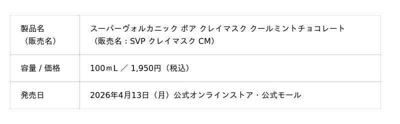アモーレパシフィックジャパン株式会社(本社:東京都渋谷区)が展開する、自然主義アクティブスキンケアブランド [INNISFREE|イニスフリー] は、2025年に発売して好評だった『スーパーヴォルカニック ポア クレイマスク クールミントチョコレート』を2026年4月13日(月)より公式オンラインストア、公式モールにて数量限定で発売いたします。