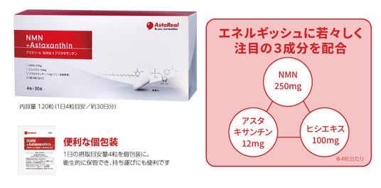 アスタリール株式会社(本社:富山県中新川郡上市町、代表取締役社長:藤井貢)は、次世代の注目成分であるNMNと防御のエース成分アスタキサンチンを配合したサプリメント「アスタリール NMN+アスタキサンチン」を、2026年4月15日(水)より医療機関取扱製品として新発売いたします。