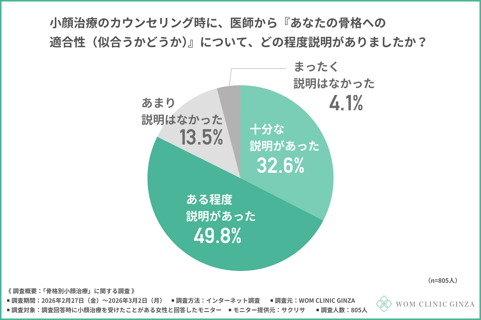 「小顔治療のカウンセリング時に、医師から『あなたの骨格への適合性(似合うかどうか)』についてどの程度説明がありましたか」と尋ねたところ、約8割が『十分な説明があった(32.6%)』『ある程度説明があった(49.8%)』と回答しました。