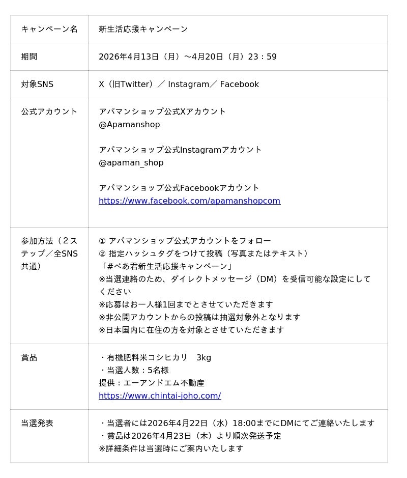 本キャンペーンは、アパマンショップ(APAMAN株式会社)による企画です。Instagram、X(Twitter)、Facebookが後援、承認、運営するものではありません。