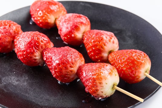 パリッと弾ける飴の食感と、ジューシーないちごの甘酸っぱさが広がる、見た目も楽しい定番スイーツです。
