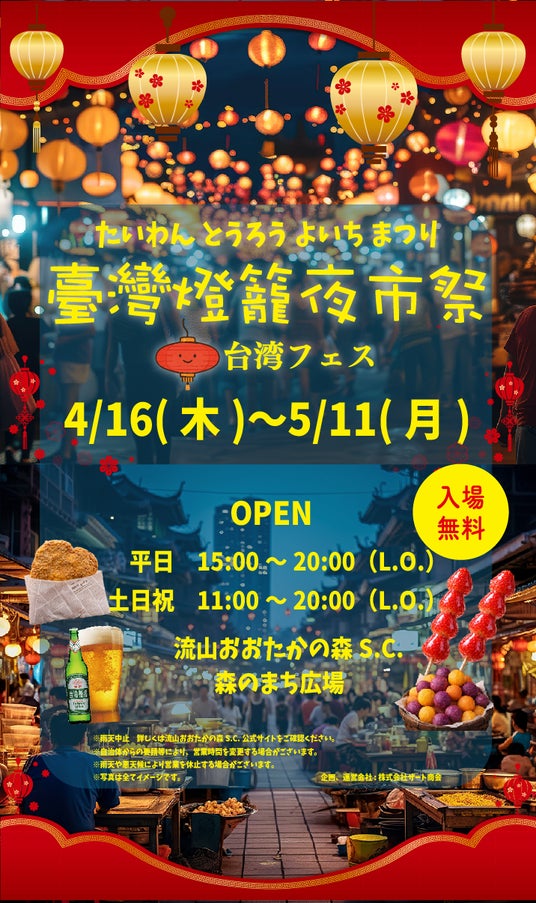 ワインやビールの輸入卸販売や飲食店経営を行うワールドリカーインポーターズ株式会社/株式会社ザート商会(本社:東京都渋谷区、代表取締役:今里尚史)は、台湾の夜市の賑わいを再現したグルメイベント「台湾燈龍夜市祭(たいわん とうろう よいち まつり) 」(以下、本イベント)を、2026年4月16日(木)~5月11日(月)の期間、流山おおたかの森S.C. 森のまち広場にて開催いたします。