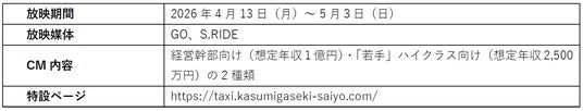 あわせて、本採用の認知拡大を目的として、2026年4月13日(月)から5月3日(日)まで、タクシーサイネージ広告( GO 、S.RIDE)にてCMの放映を開始いたします。