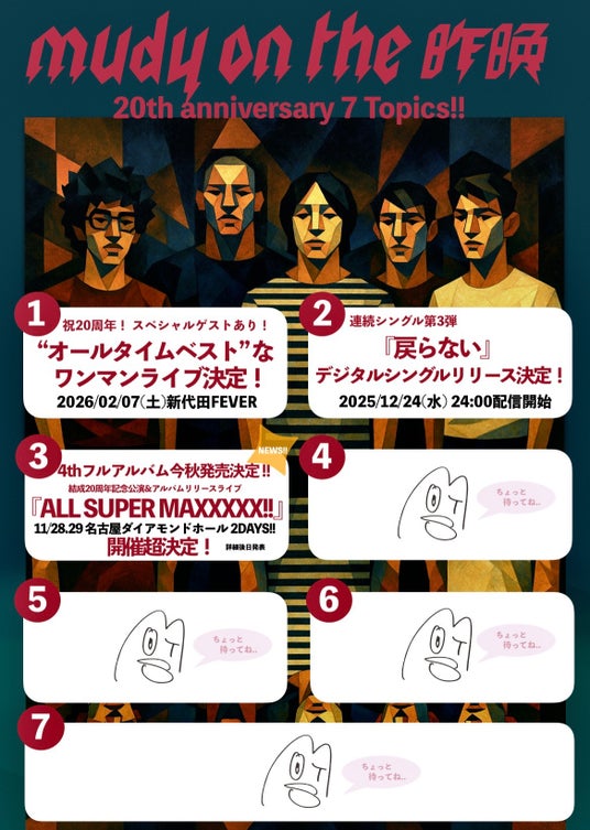 そして、4thアルバムレコ発&バンド結成20周年を祝した記念公演となる自主企画『ALL SUPER MAXXXXX!!』の開催も決定!自身の企画としては最大キャパシティとなる名古屋ダイアモンドホールにて、2026年11月28日~29日の2DAYS開催となる。「mudy on the 昨晩のこれまでの歴史に欠かすことの出来ない盟友や、多大な影響を受けたバンド、これからに繋がるバンドを集めた盛大な祭りになる」とフルサワヒロカズ。出演者・チケット受付などの詳細は後日発表。
