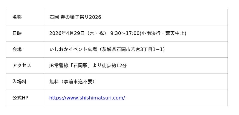 石岡市 春の獅子祭り実行委員会(所在地:茨城県石岡市)は、2026年4月29日(水・祝)に「いしおかイベント広場」にて、春の訪れを祝うイベント「石岡 春の獅子祭り2026」を開催いたします。
