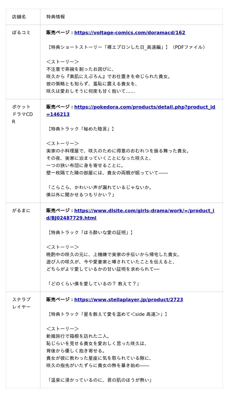 本作の発売を記念し、「ぼるコミ」では期間限定で25%オフとなるキャンペーンを実施しております。また、「DLsiteがるまに」「ポケットドラマCD R」「ステラプレイヤー」では、事前予約いただくと本作が10%オフとなるキャンペーンも実施しております。さらに、各配信ストアごとに購入特典もご用意しておりますので、ぜひご注目ください。