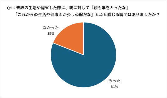 Q1:普段の生活や帰省した際に、親に対して「親も年をとったな」「これからの生活や健康面が少し心配だな」とふと感じる瞬間はありましたか?「あった」(81%)「なかった」(19%)と回答。