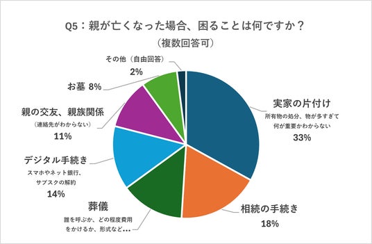 Q5:親が亡くなった場合、困ることは何ですか?(複数回答可)1位が「実家の片付け」(33%)、次いで「相続の手続き」(18%)「葬儀」(14%)「デジタル手続き」(14%)で困る人が多く、子ども世代の切実な不安が顕在化した。