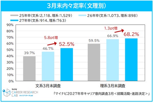 2027年卒学生の3月末の内々定保有率は、前年同月から4.1pt増加し、58.7%だった。3月1日調査時点では46.0%で、約1カ月で12.7pt増となった。文理別で見ると、文系学生は52.5%(前年同月比5.8pt増)、理系学生は68.2%(前年同月比1.3pt増)と、理系学生の方が高いが、前年同月比の上り幅は、文系学生の方が理系学生よりも大きい。【図1、2】