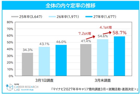 27年卒学生の3月末時点の内々定保有率は58.7%。内々定を持ちながら就職活動を継続する学生は前年同月比5.1pt増。未内々定者と合わせた活動継続率は76.2%