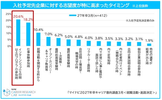 現時点で入社意思がもっとも高い企業を発見したきっかけを聞くと、「就職情報サイト(15.7%)」が最多で、次いで「仕事体験(就業体験ができる短期間プログラム)(14.9%)」、「インターンシップ(5日間以上のプログラム)(13.2%)」となった。また、入社予定先を決めている学生に、志望度が特に高まったタイミングを聞いたところ、「インターンシップ(5日間以上)(20.6%)」がもっとも多く、次いで、「仕事体験(18.2%)」となった。インターンシップ等のキャリア形成プログラムが、学生の内々定先への入社意思や入社予定先の決定に大きな影響を与えていることがわかる。【図5、6】【図5】
