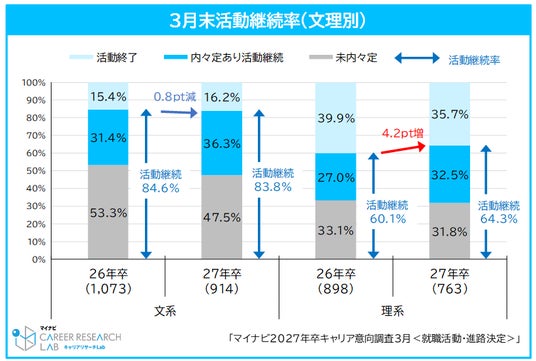 内々定を持ちながら就職活動を継続する学生は34.8%で、前年同月比5.1pt増加した。未内々定者と合わせた活動継続率※1は76.2%(前年同月比1.1pt増)となった。内々定率は前年から増加したものの、前年と同程度の学生が就職活動を継続している状況である。文理別では、文系学生は83.8%(前年同月比0.8pt減)、理系学生は64.3%(前年同月比4.2pt増)と、理系学生は前年同月より活動を継続している学生が多い。【図3、4】