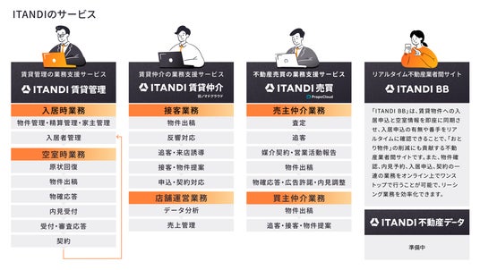 不動産賃貸・売買の取引における一連の業務をDXするサービスを提供しています。不動産賃貸領域ではリアルタイム不動産業者間サイト「ITANDI BB」のほか、「ITANDI BB」と連携する賃貸管理の業務支援サービス「ITANDI 賃貸管理」や、賃貸仲介の業務支援サービス「ITANDI 賃貸仲介(旧「ノマドクラウド」)」を展開。不動産売買領域では不動産売買の業務支援サービス「ITANDI 売買 PropoCloud」を展開し、それぞれの領域でなめらかな業務体験と取引体験を実現しています。