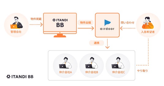 テクノロジーで不動産取引をなめらかにするイタンジ株式会社(以下「当社」)は、2026年4月より、当社が提供するリアルタイム不動産業者間サイト「ITANDI BB」と、株式会社エアドア(以下「エアドア社」)が提供するダイレクト賃貸検索サービス「airdoor」(以下「エアドア」)の連携を開始しました。これにより、エアドアとの連携を希望する賃貸不動産管理会社(以下「管理会社」)は、「ITANDI BB」に掲載している一都三県の物件情報を、エアドアに連携できるようになります。