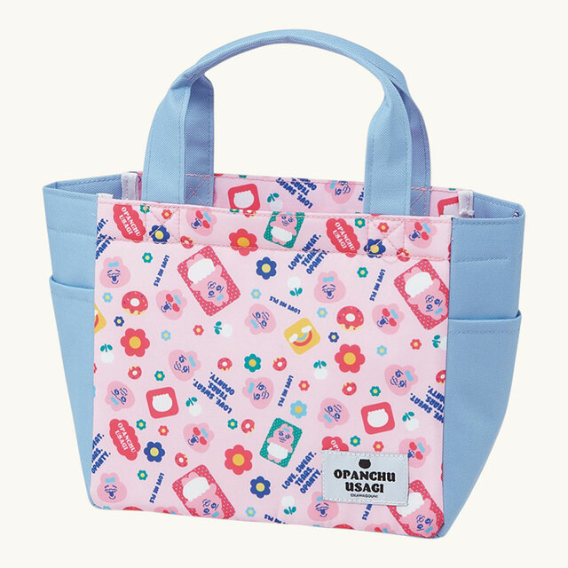 デザインはピンクやブルーを基調に、「おぱんちゅうさぎ」のさまざまな表情を散りばめた総柄。花やドーナツ、虹といったモチーフもあしらわれていて、持つだけで気分が上がりそうなかわいさです♪
