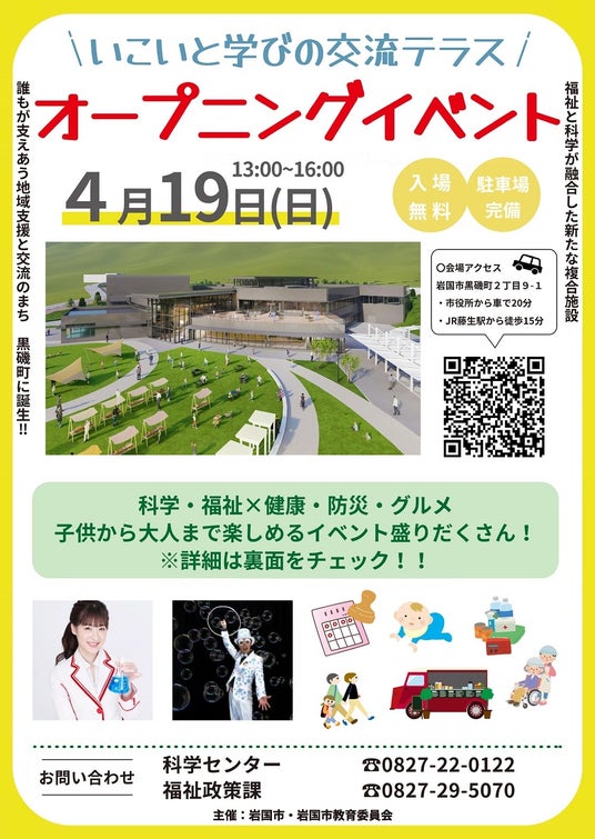山口県岩国市は、黒磯地区の岩国医療センター跡地において整備を進めてきた複合施設「いこいと学びの交流テラス」にて、2026年4月19日(日)13時からオープニングイベントを開催し、2026年4月21日(火)から施設の利用を開始いたします。