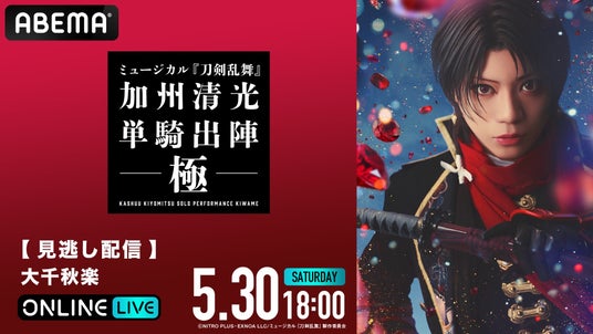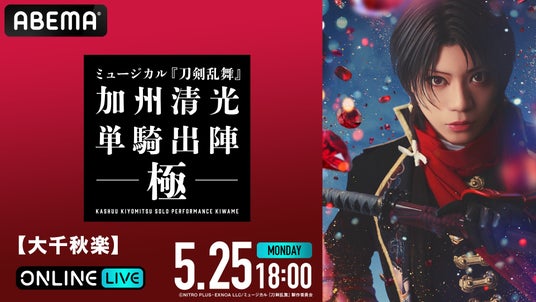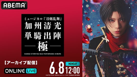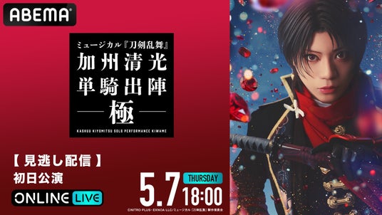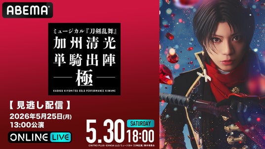 新しい未来のテレビ「ABEMA」は、「ABEMA PPV(アベマ ペイパービュー)」にて、ミュージカル『刀剣乱舞』 加州清光 単騎出陣 極の2026年5月1日(金)初日公演、5月25日(月)13時公演、および同日18時からの大千秋楽公演を生放送することを決定いたしました。また、本公演のチケットを2026年4月13日(月)13時より発売開始いたします。