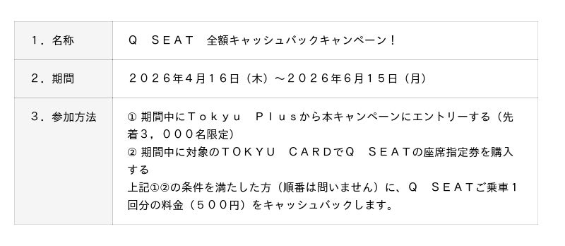 本キャンペーンは、実施期間中にエントリー(先着3,000名限定)のうえ、対象のTOKYU CARDでQ SEATの座席指定券を購入いただいたお客さまに、Q SEATご乗車1回分の料金(500円)をキャッシュバックするものです。