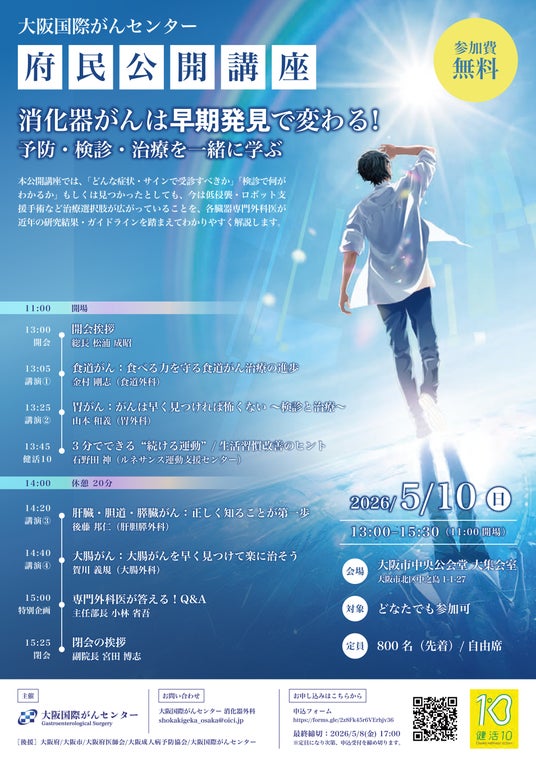 大阪国際がんセンター(所在地:大阪市中央区、総長:松浦 成昭)は、2026年5月10日(日)、大阪市中央公会堂 大集会室にて、府民公開講座「消化器がんは、早期発見で変わる。」を開催します。