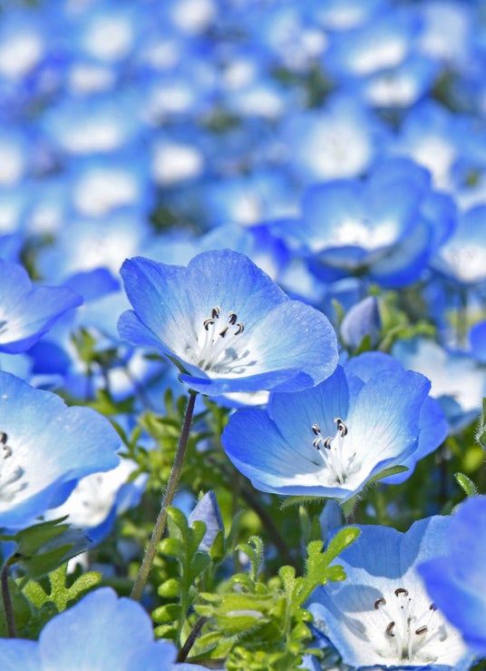 青の絶景をつくる、小さな花ネモフィラはムラサキ科(旧ハゼリソウ科)ネモフィラ属で、北アメリカ原産の一年草。高さ10~20cmほどの株に、直径2~3cmの小さな青い花を咲かせます。和名の「瑠璃唐草」は、瑠璃色の花と唐草模様に似た葉の形に由来。英名の「Baby blue eyes」は花の中心部が白く、小さくて愛らしい青い花の様子が、無垢で美しい赤ちゃんの青い瞳を連想させることに由来しています。