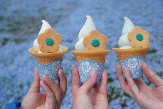 ネモフィラとあわせておすすめしたいのが、春限定のネモフィラグルメです。大好評の「ネモフィラブルーソフト」や「児玉冷菓のババヘラアイス『ネモフィラ』」など、人気のスイーツが勢ぞろいします。青い花のハーブ“バタフライピー”で色づけした「ネモフィラブルーラテ」は、茨城県産のハチミツを使用した数量限定のハニーミルク。フローラルな香りとやさしい甘さが特徴の一杯です。