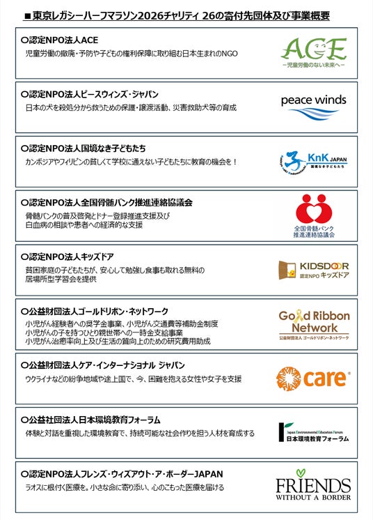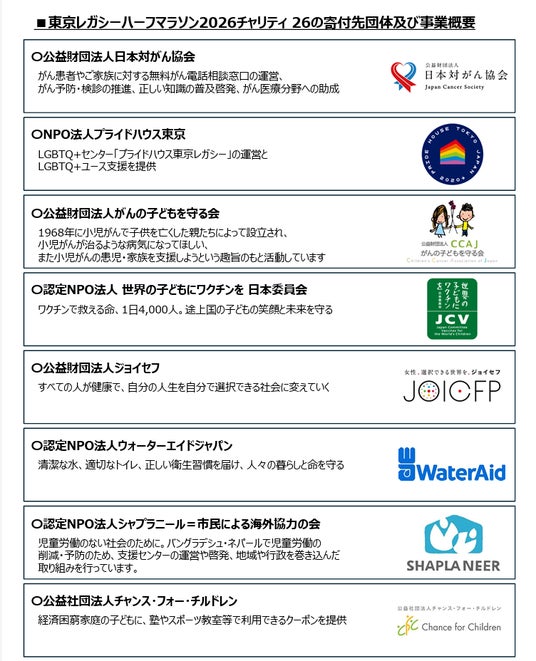 一般財団法人東京マラソン財団チャリティRUN with HEARTでは、東京レガシーハーフマラソン2026[2026年10月18日(日)開催]の寄付申込及びチャリティランナーを4月15日(水)より受付けます。
