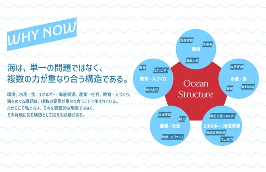 海というものを、5つの領域の視点から捉え、それぞれの領域を代表する立場から議論を重ね、海の未来について対話する。