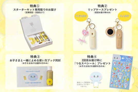 株式会社鈴木ハーブ研究所は、2026年4月13日(月)より「2026年限定ムダ毛ケア*1スターターキット」を公式特設ページのみの数量限定で販売開始いたしました。初回ご購入の方のみ、最大56%OFF*2の限定価格です。また、定期初回購入時の限定特典として<大人向け><子ども向け>で選べる2色のリップケースをご用意。さらに<子ども向け>を選択の方には、定期2回目のお届け時に弊社オリジナルキャラクターつるぺんの「つるスベシール」をプレゼントいたします。