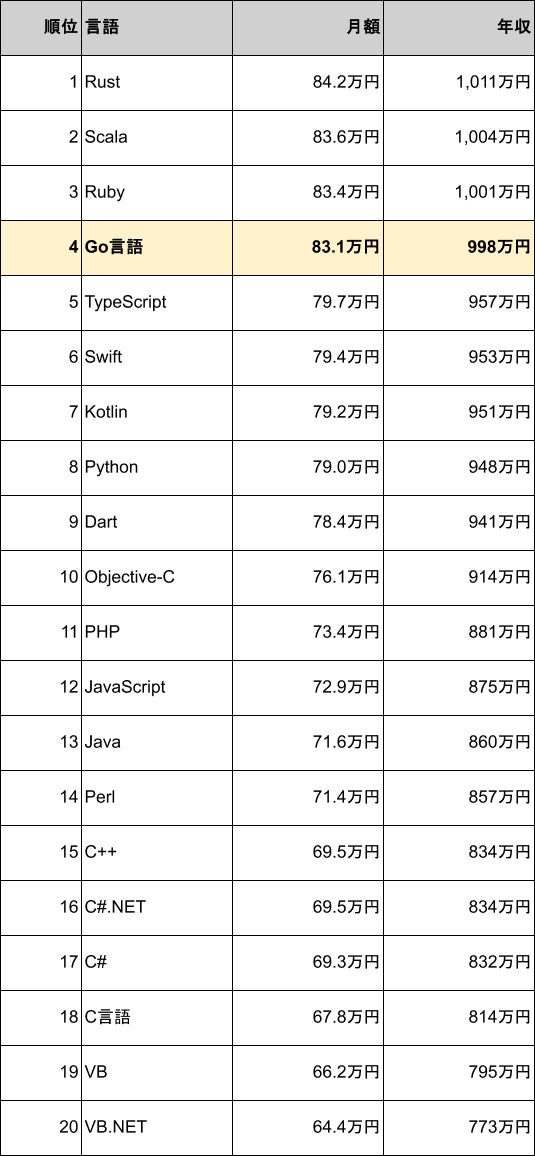 Go言語案件の平均月額単価は83.1万円、平均年収は998万円で、プログラミング言語別の年収ランキングでは4位に位置しています。