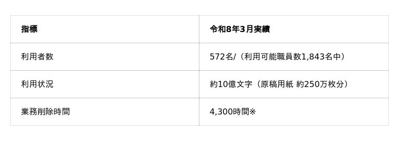 - 生成AIサービスを活用した業務効率化により、令和7年度下半期:約17,200時間(約17.5人月分)の業務時間削減を実現 ※導入サービスで計算された業務削減時間