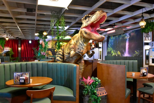 店内外に20体以上の恐竜が占拠するレストラン。恐竜をイメージしたメニューにも注目!