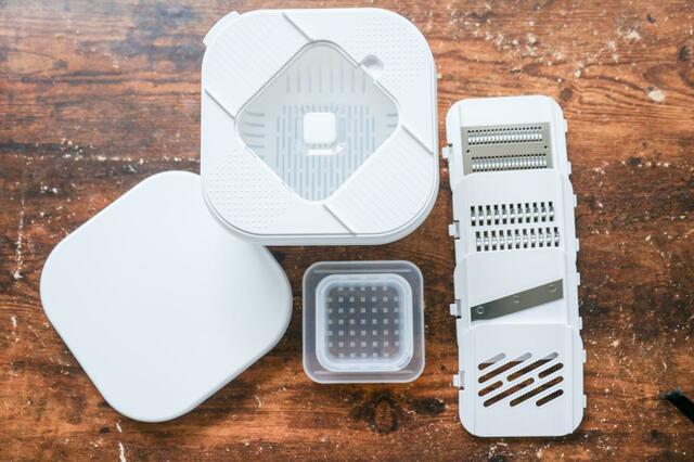 スライサー、おろし器、千切り(太・細)の機能はもちろん、ザルやボウル、中フタまでセットになっている優れモノ。