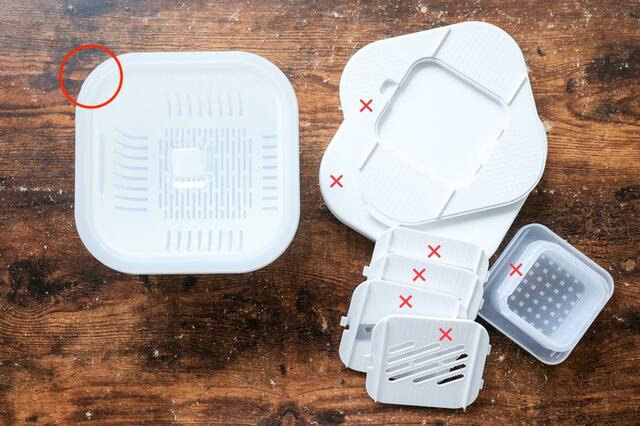 スライサーの刃がついた上フタなどは電子レンジ不可なので、加熱する前に必ず付け替える必要があります。