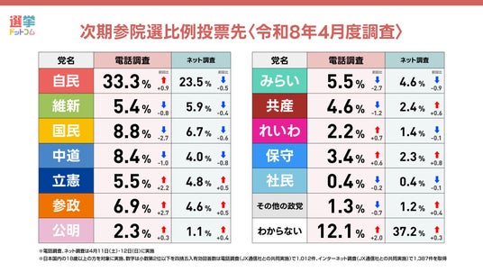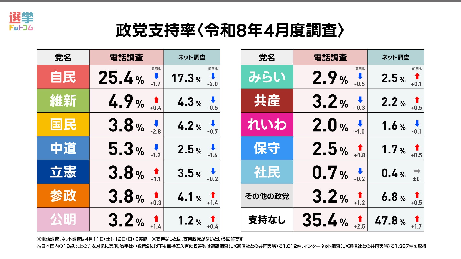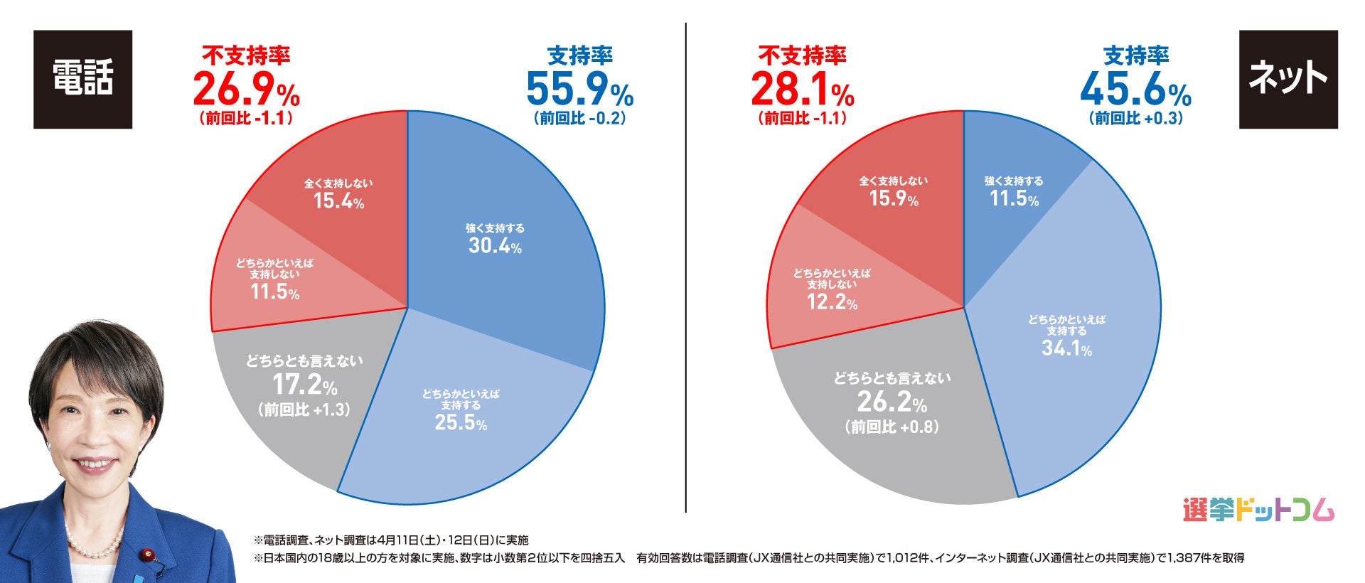 【調査概要】調査は令和8年4月11日(土)・12日(日)の2日間に実施。日本国内の18歳以上の方を調査対象とし、有効回答数は電話調査で1012件、インターネット調査で1387件を取得(いずれもJX通信社との共同実施)。各数値は小数第2位以下を四捨五入しています。