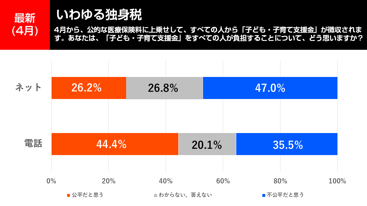 「4月から、公的な医療保険料に上乗せして、すべての人から『子ども・子育て支援金』が徴収されます。あなたは、『子ども・子育て支援金』をすべての人が負担することについて、どう思いますか?」と聞いた結果が上の図です。