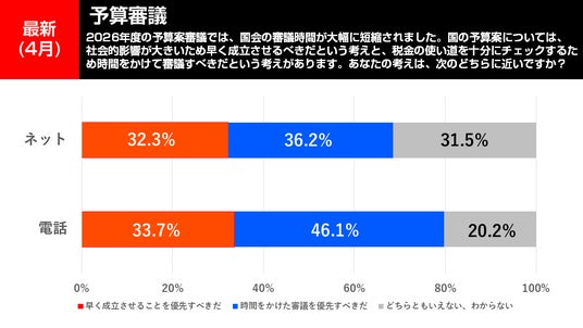 「2026年度の予算案審議では、国会の審議時間が大幅に短縮されました。国の予算案については、社会的影響が大きいため早く成立させるべきだという考えと、税金の使い道を十分にチェックするため時間をかけて審議すべきだという考えがあります。あなたの考えは、次のどちらに近いですか?」と聞いた結果が上の図です。