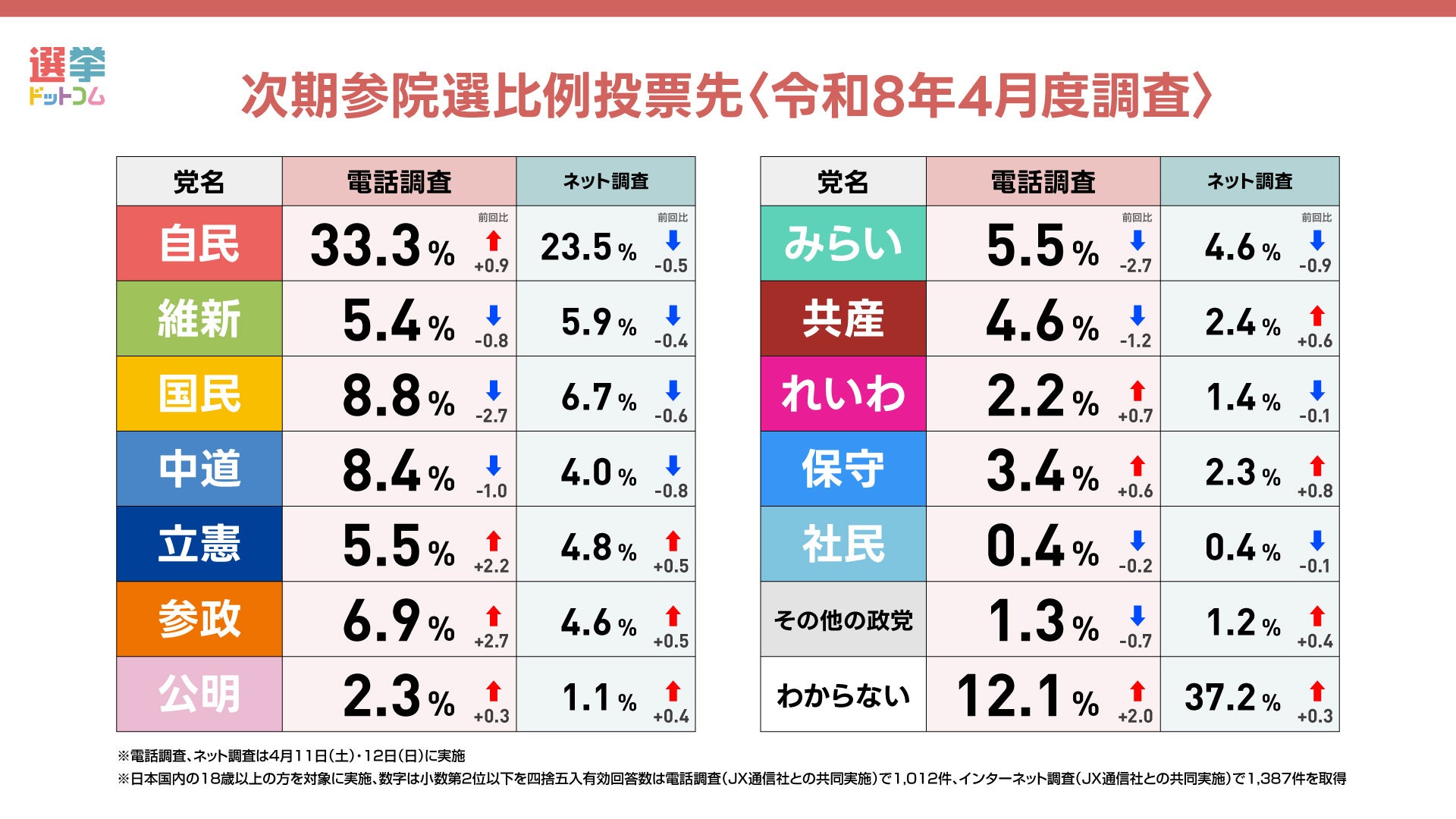 選挙ドットコムはJX通信社と共同で、4月11日(土)、12日(日)に日本国内の18歳以上の方を対象としたハイブリッド調査による全国意識調査を実施しました。