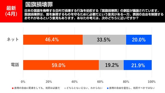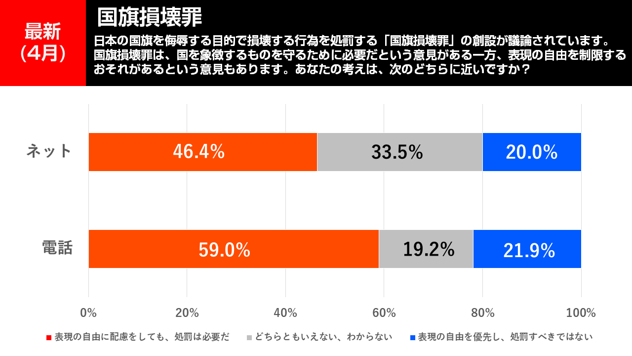 「日本の国旗を侮辱する目的で損壊する行為を処罰する「国旗損壊罪」の創設が議論されています。国旗損壊罪は、国を象徴するものを守るために必要だという意見がある一方、表現の自由を制限するおそれがあるという意見もあります。あなたの考えは、次のどちらに近いですか?」と聞いた結果が上の図です。