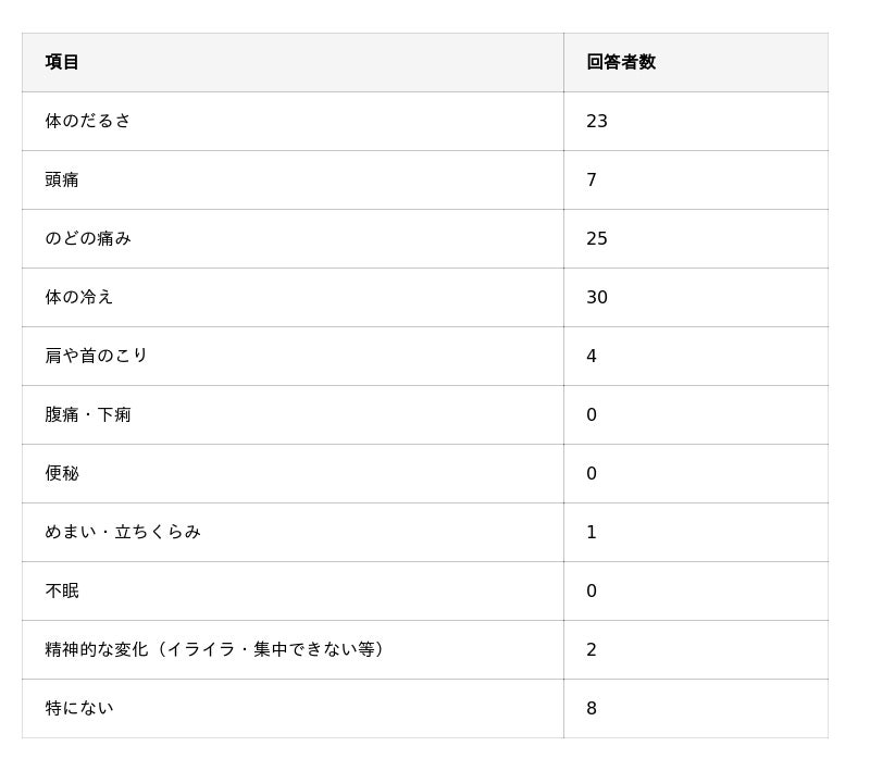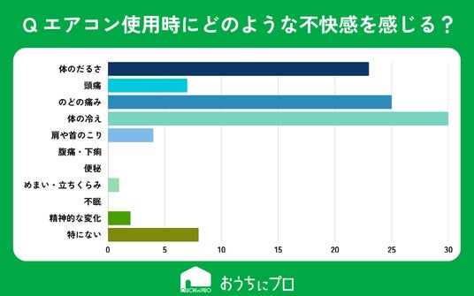 - エアコン使用時の不快感は「体の冷え」「のどの痛み」「体のだるさ」が最も多い。