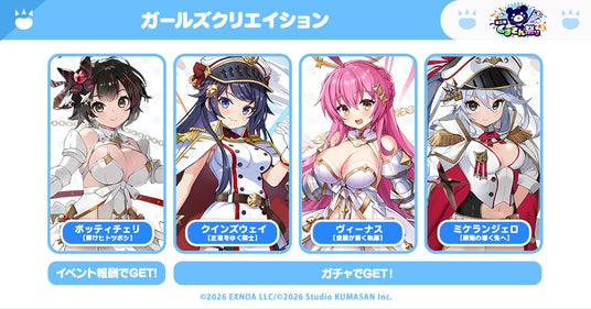 『第二回くまさん祭り』限定コラボキャラクターとして「ボッティチェリ【輝けヒトツボシ】」「クインズウェイ【正道をゆく騎士】」「ヴィーナス【金星が描く軌跡】」「ミケランジェロ【黒煙の導く先へ】」が新たに登場します!