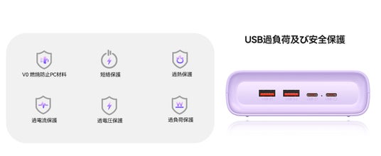 4つのUSBポート: USB-C ×2 + USB-A ×2 を搭載。スマホやタブレット、イヤホンなどをこれ一台で直接充電可能です。